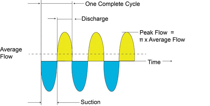 1. 泵送動(dòng)作是由往復(fù)動(dòng)作發(fā)展而來的。這種往復(fù)運(yùn)動(dòng)產(chǎn)生流動(dòng)正弦波。實(shí)際流量由圖 1 中的公式確定。
